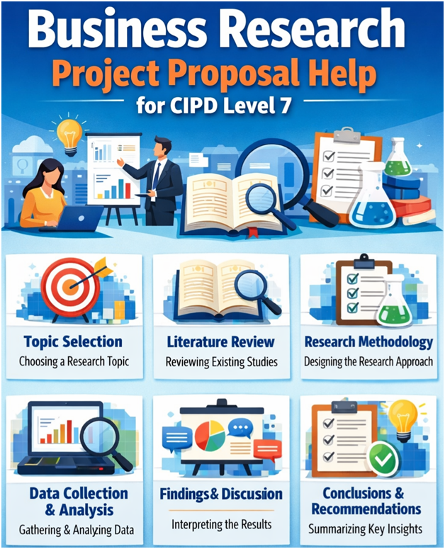 After a learner identifies an organisational issue, they proceed to critically review relevant academic and professional literature. Next, propose justifiable research methodologies. Each CIPD Level 7 business research proposal concludes with translating evidence-based findings into practical, ethical, commercially sound recommendations for stakeholders.
